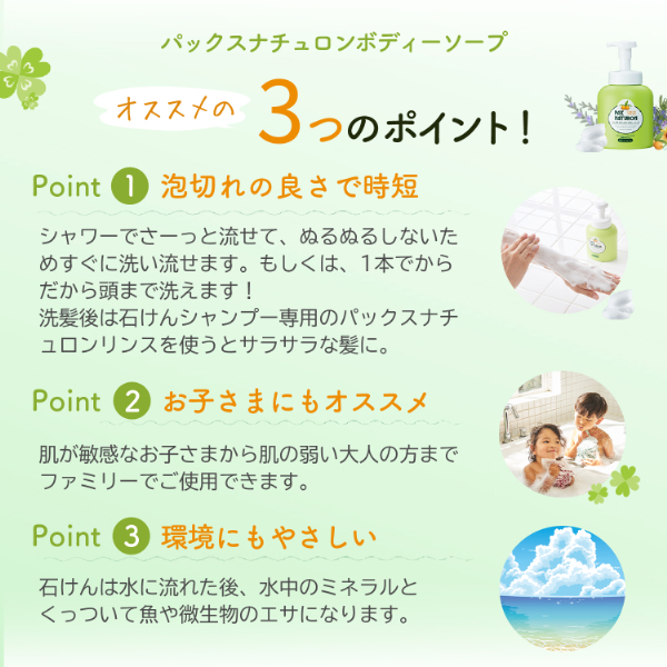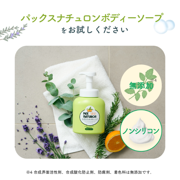 *洗髪にご使用の際は、石けんシャンプー専用のリンスで仕上げてください。(パックスナチュロンリンスとのセット使用がおすすめです。)