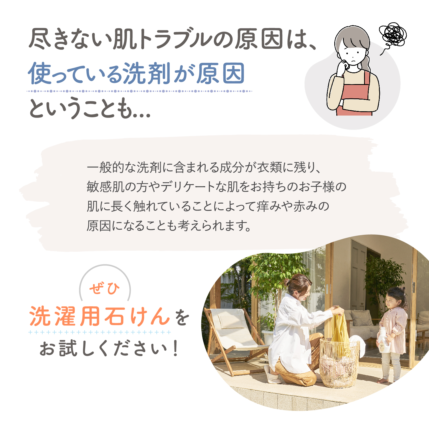 忙しくて溶かす必要のない石けんを使いたいとき、粉石けんではどうしてもくしゃみが出るとき、冬場の洗濯でお風呂の残り湯が使えないときなど、いろいろな事情に合わせて液体石けんをお使い下さい。ただし、洗浄力は粉石けんよりマイルドなので、ひどい汚れ物を洗うときは使用量を多めにしたり、酸素系漂白剤との併用をおすすめします。