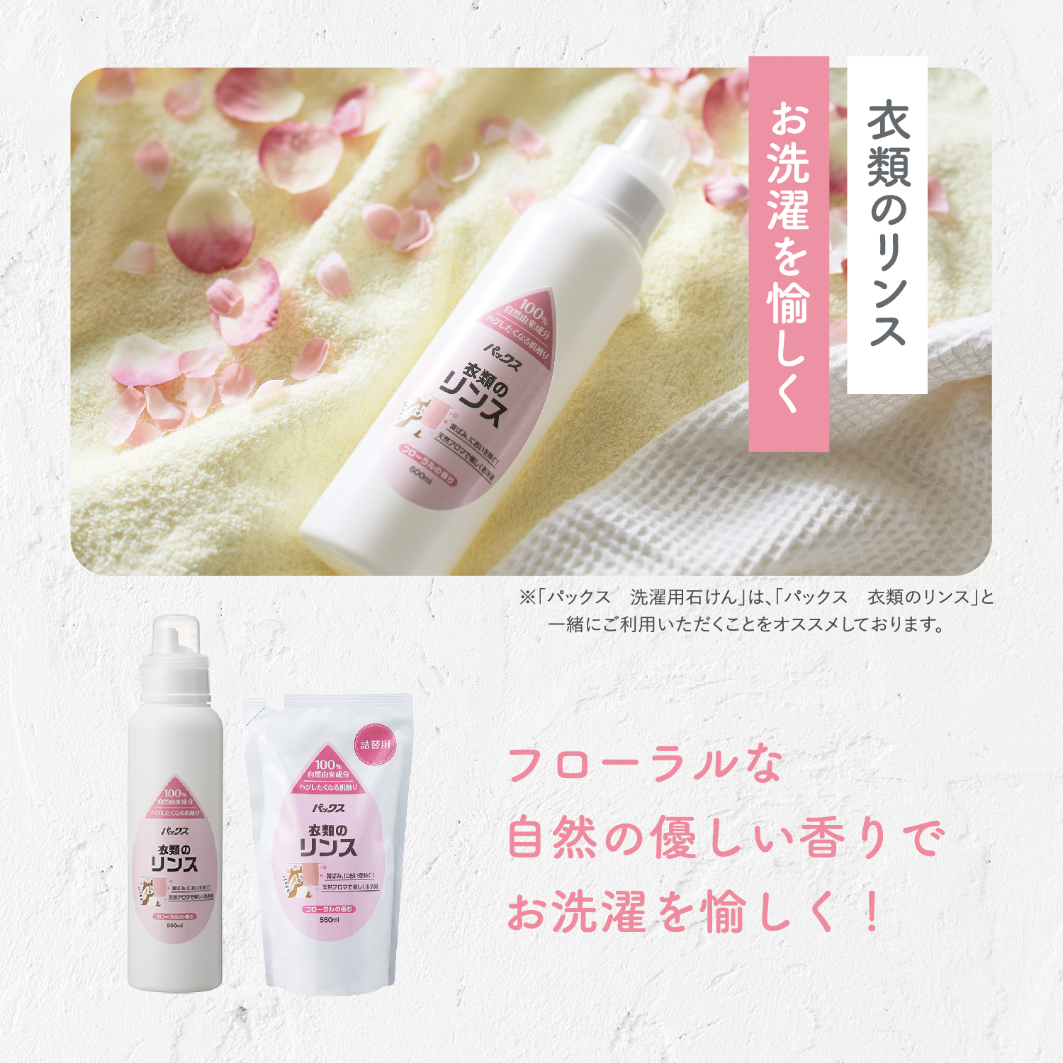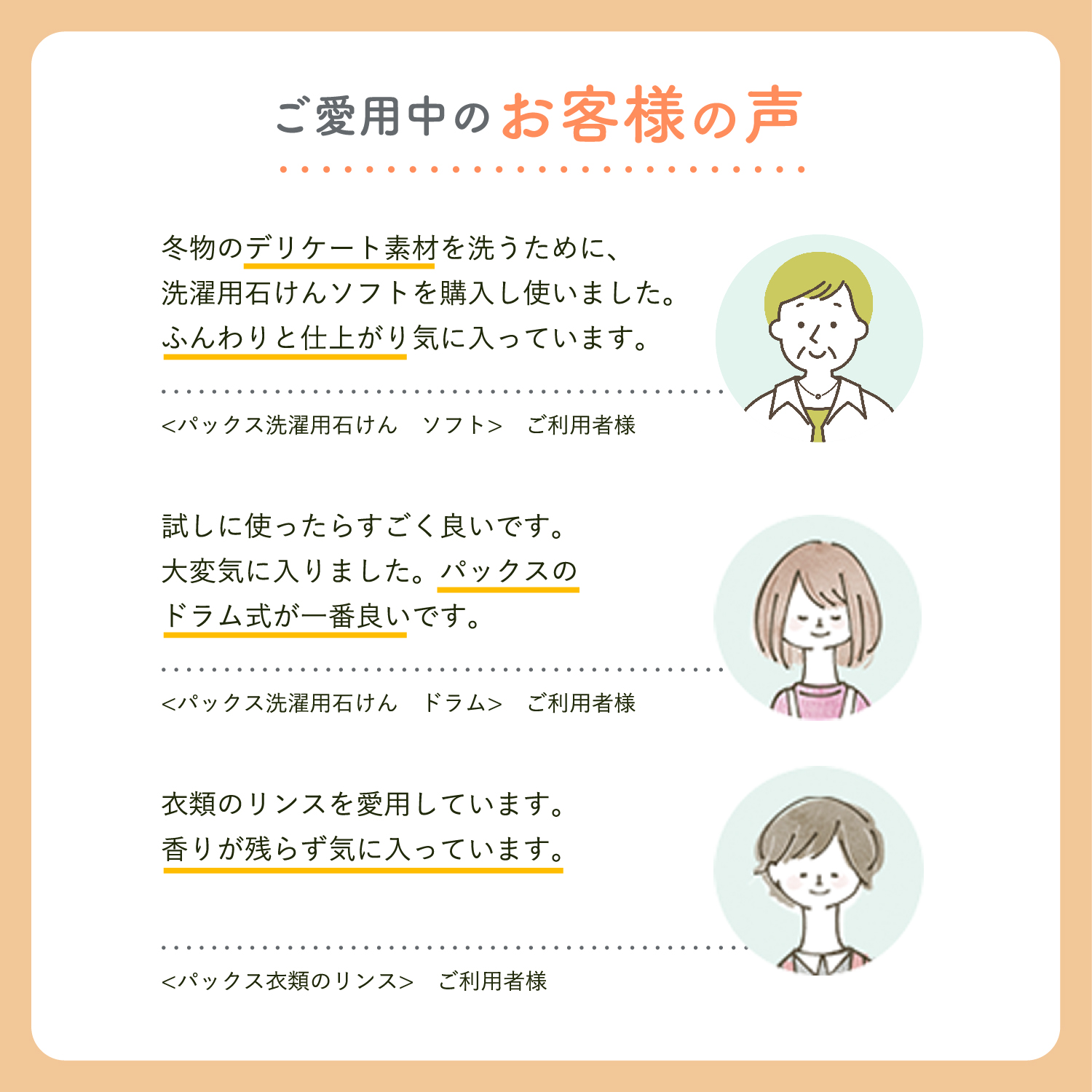 石けん洗濯専用仕上げ剤の「パックス 衣類のリンス」をご使用も石けんカス防止の一助となります。