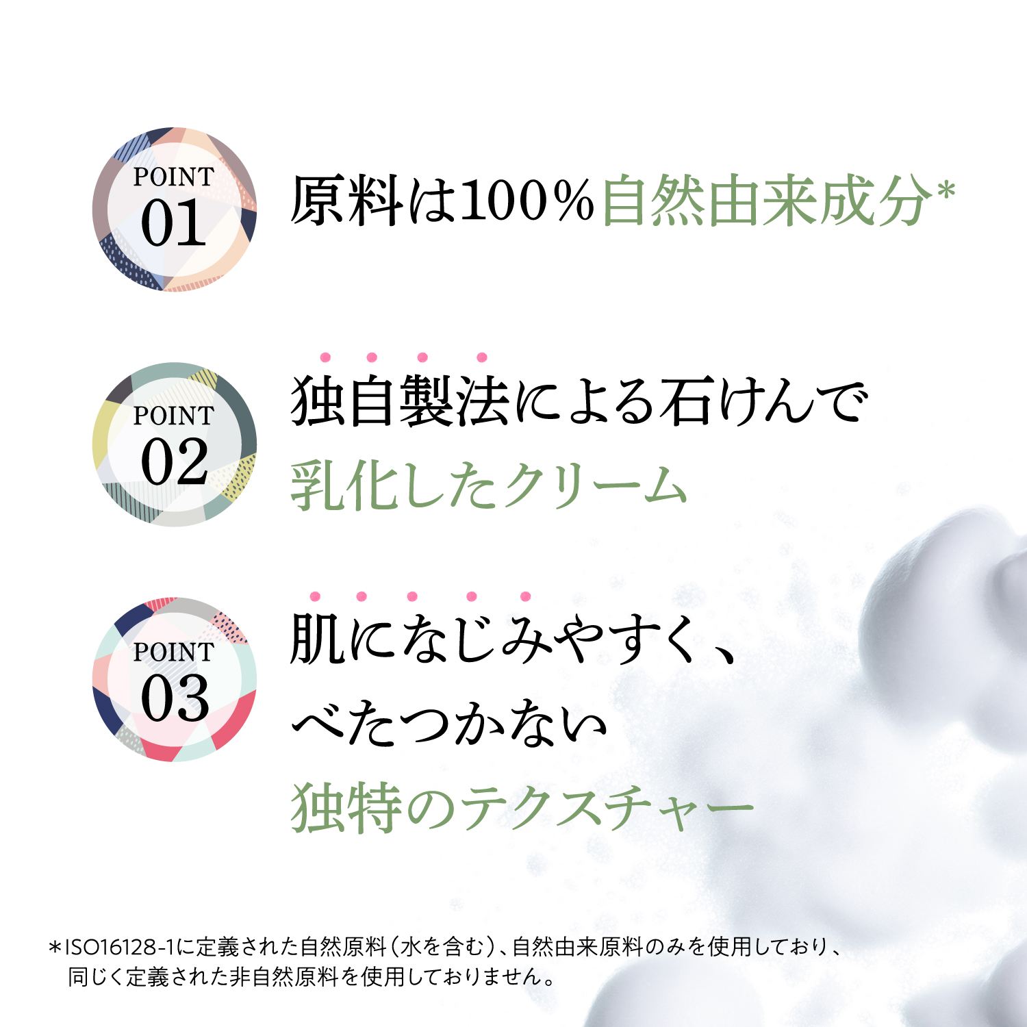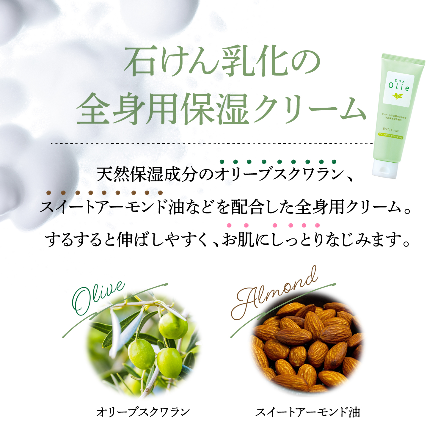 天然保湿成分のオリーブスクワラン、スイートアーモンド油などを配合した全身用クリーム。