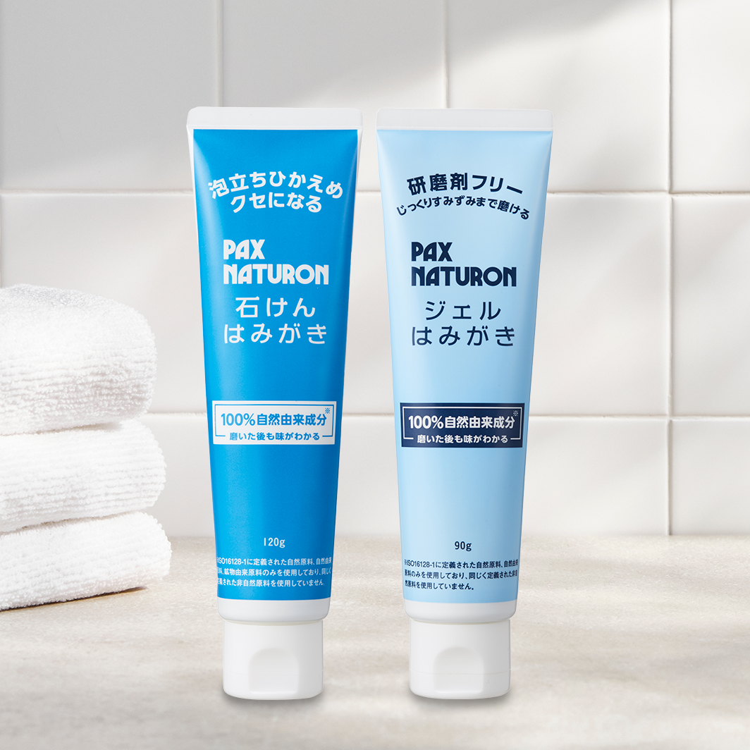 爽快ハッカタイプの石けんはみがきと、研磨剤フリーで、じっくりすみずみまで磨け、電動歯ブラシにも使用できるジェルはみがきのセットです。