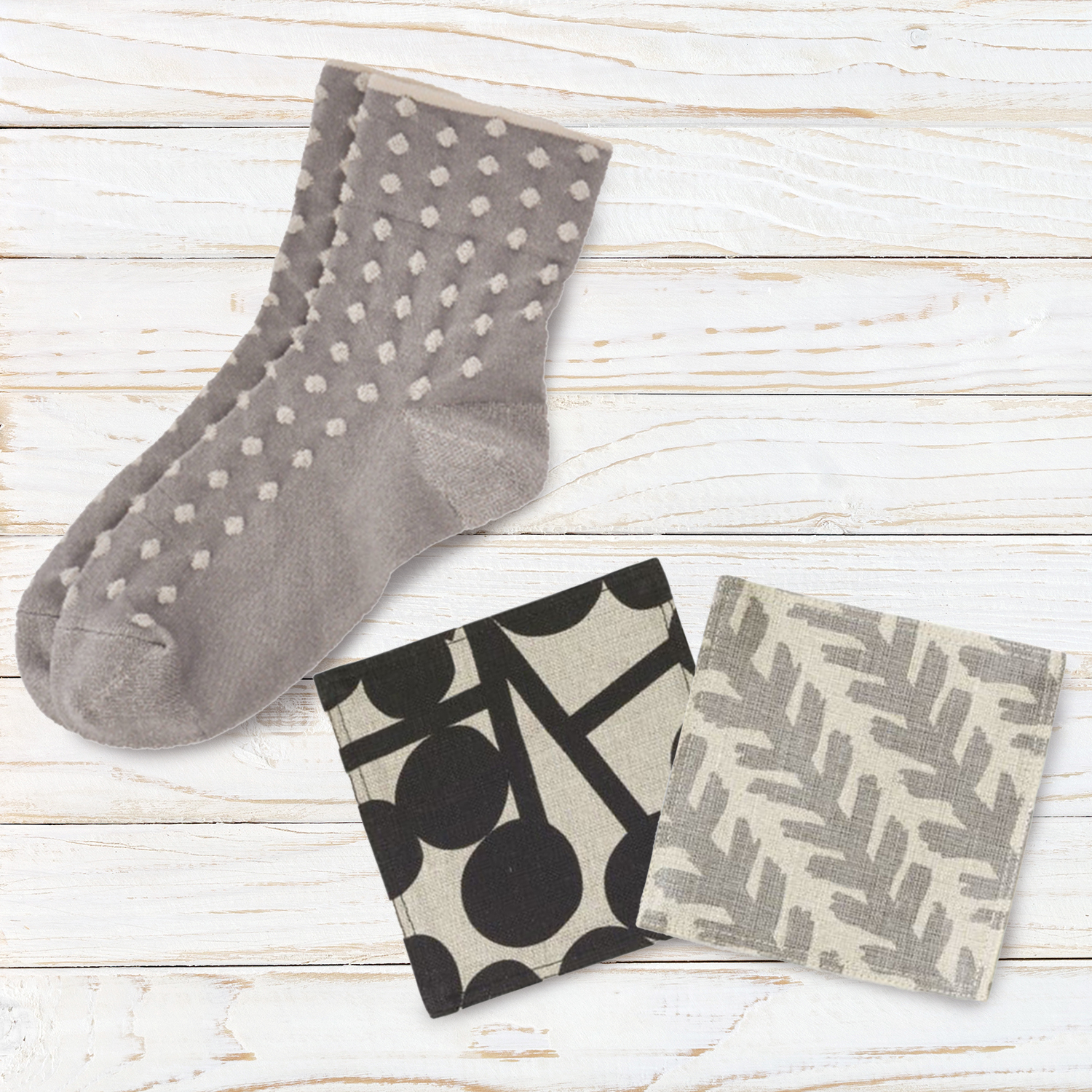 14,000円以上で選べる! 足も、暮らしも、ふわっと心地よく 野に咲く花々や木の実など、自然が与えてくれる喜びや安らぎを表現したコースターと、 水玉がかわいいゴムなしソックスのセット |